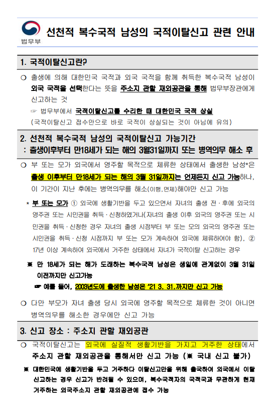 1. 대상 : 출생과 동시에 한국국적과 외국국적 함께 취득한 남성