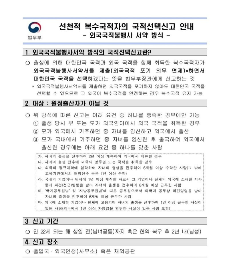 1. 대상 : 출생과 동시에 한국국적과 외국국적 함께 취득