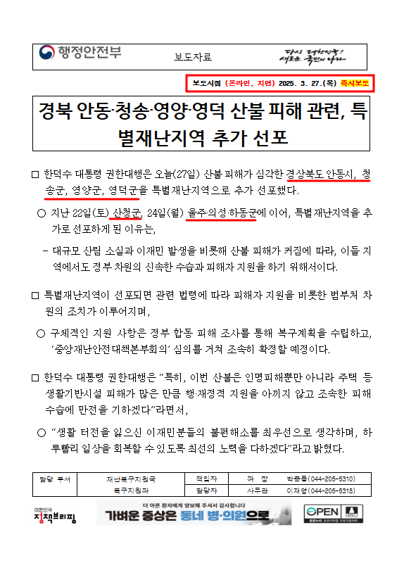 1. 해당 재난 지역 선포 일부 터 ~ 현재까지(3.27.)